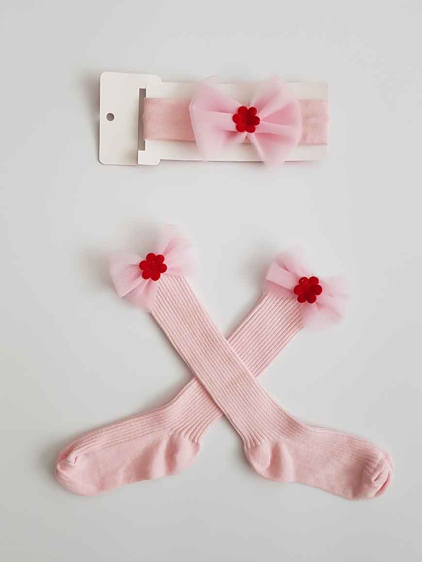 Pamuk çorap. 3-4 yaş için uygundur. Saç bantlı set. Tül fiyonklu.