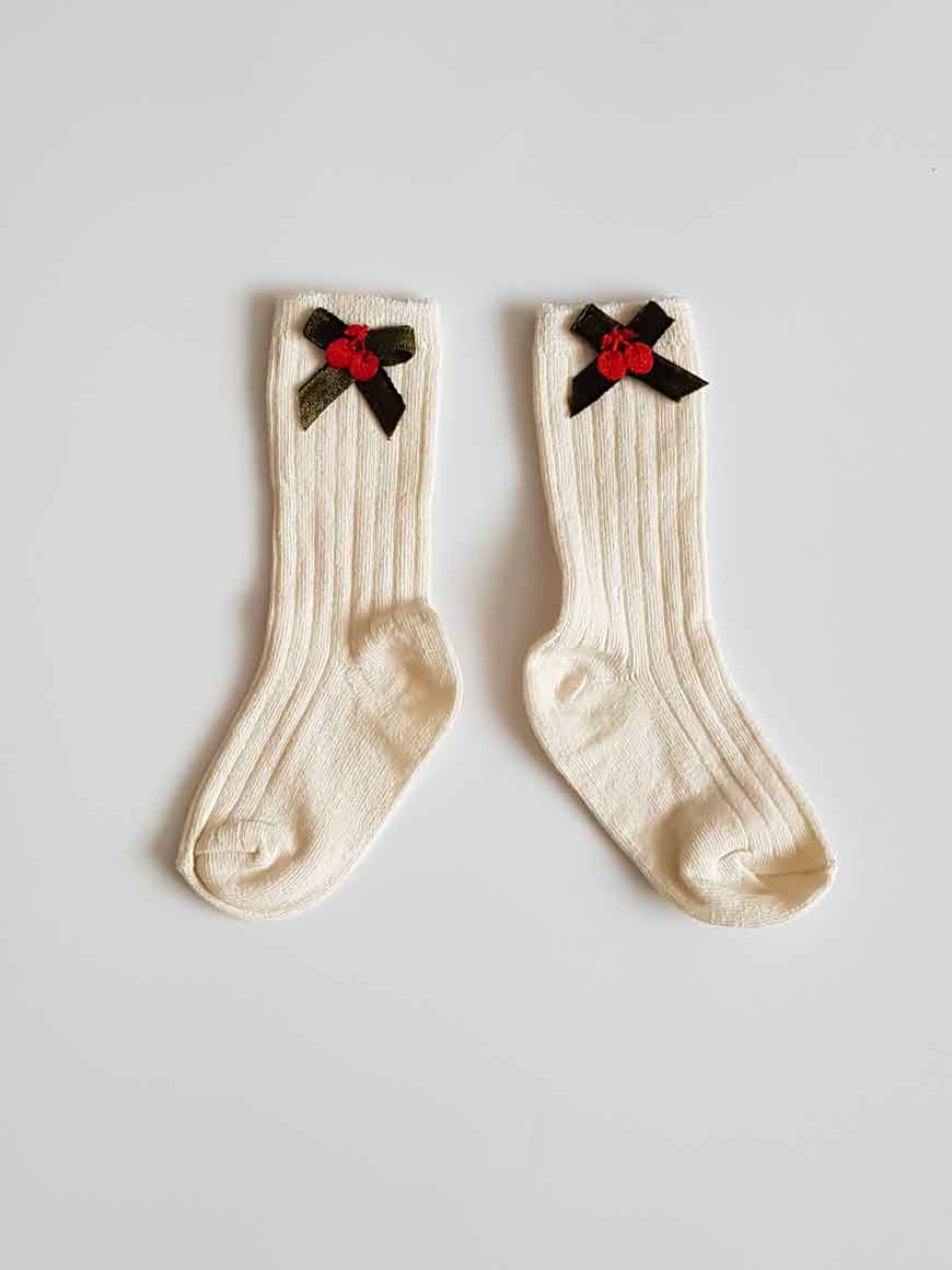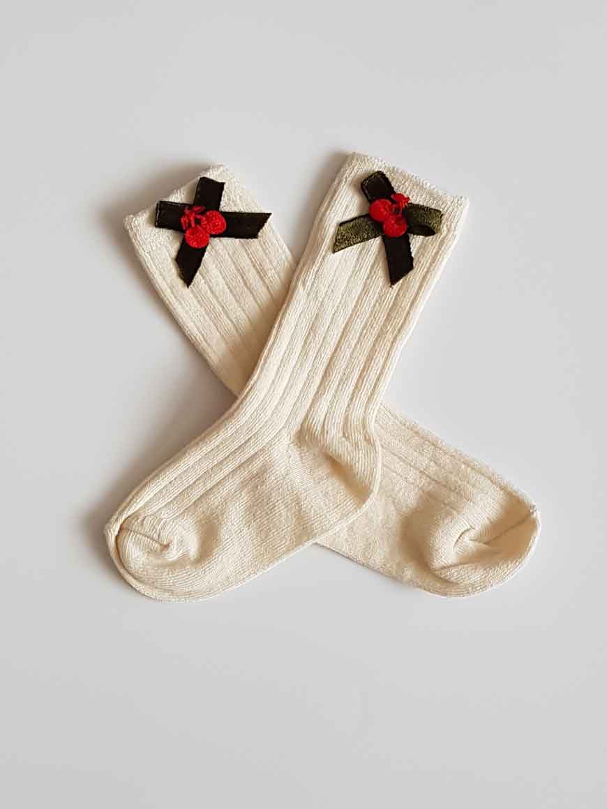 Pamuk çorap. Krem renk. Kirazlı fiyonk.