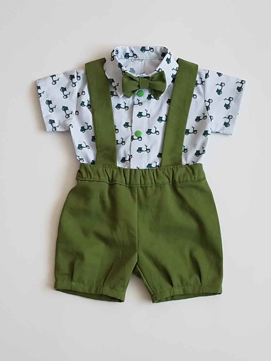 Gömlek vespa desenli pamuk kumaş ve çıt çıtlı. Papyon lastikli ve çıt çıtlı. Şort gabardin kumaş. Şort askıları arkadan çıt çıtlı. Şort beli lastikli. Özel tasarım. Özel dikim.