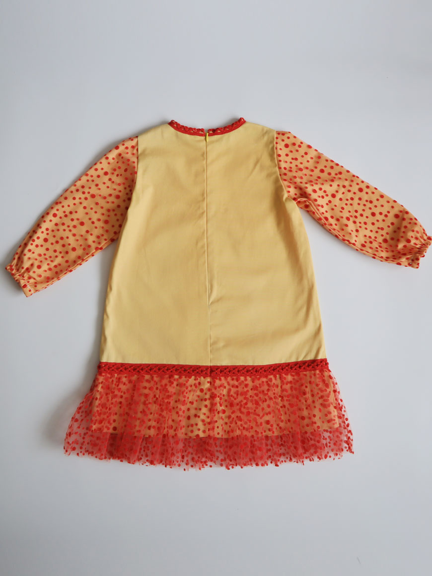 Gabardin kumaş ve kadife puantiye baskılı tülden hazırlanmıştır.