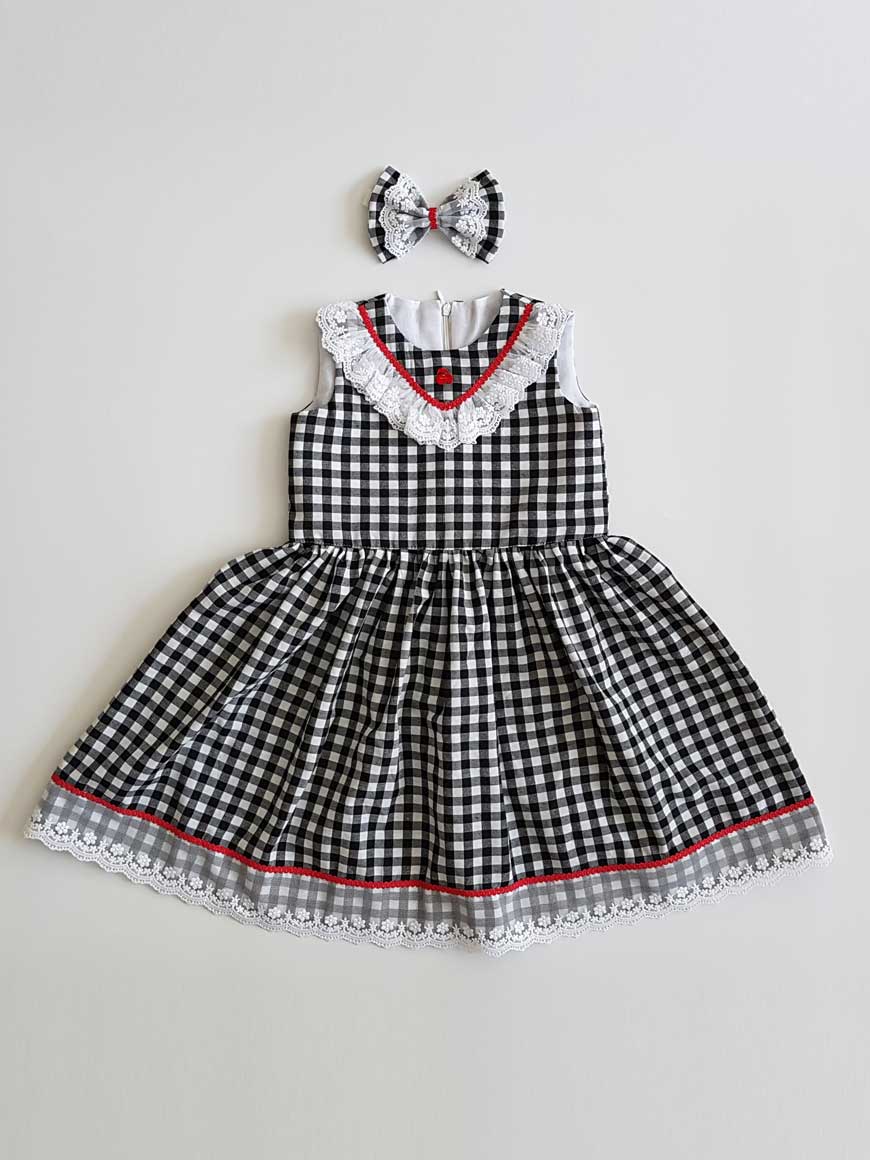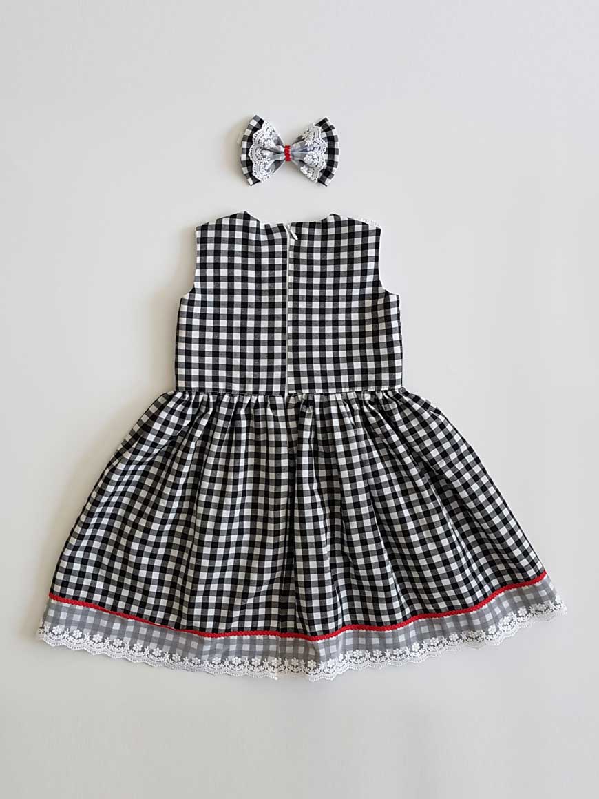 Arkadan fermuarlıdır. Elbise kumaşından hazırlanan saç bandı elbiseye dahildir.